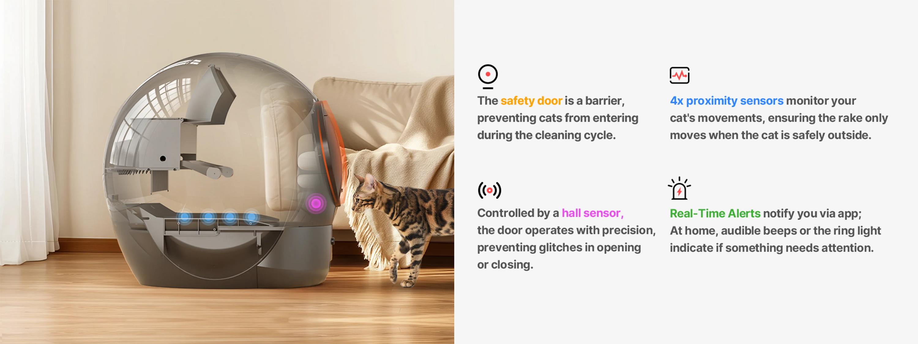 Absolutely! The Spaceship II has four sensors that work together to make sure it only cleans when your cat isn't inside. You can set the clean cycle delay up to 30mins for extra control. During cleaning, the safety door closes and only reopens once cleaning is complete—keeping curious cats from peeking in. If the door senses any nudges, you’ll get an app notification, so you’re always up-to-date on your cat's activity!