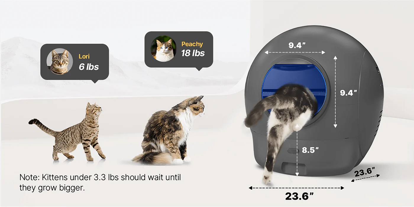 The Spaceship II is suitable for kittens over 3.3 lbs and at least 5 inches in shoulder height. It’s designed to handle larger cats too, comfortably supporting up to 25 lbs with its spacious 60L capacity—making it a cozy fit for cats of all sizes!